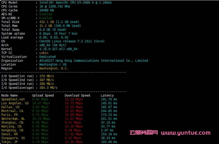 可以看到这款香港站群服务器采用E5-2660处理器,主频2.2GHz,磁盘I/O在384MB/秒,性能是相当可以的。国内和全球各地上传和下载速度都跑满了10Mbps,因为我这个服务器选择的是10Mbps的带宽,所以最大带宽是跑满了的,你可以自定义选择需要的带宽。