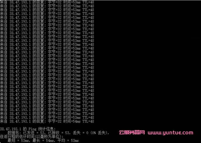 可以看到我本地Ping的延迟在53ms左右,这个延迟对于香港机房来说还是相当不错的,如果你在东南地区,那么这个延迟还会更低。可以看到网络是相当稳定的,基本都没有丢包的情况。