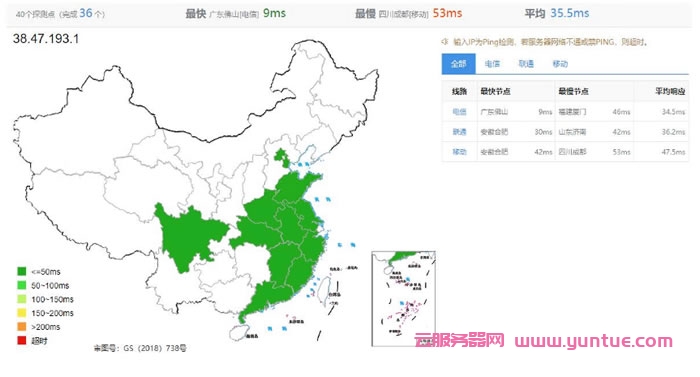 从上面工具的测试可以知道,全国Ping的平均延迟在35ms左右,比我本地要低很多。其中电信和联通网络都差不多在35ms左右,移动网络稍微高点在47ms左右,总体来说三网延迟都很低。