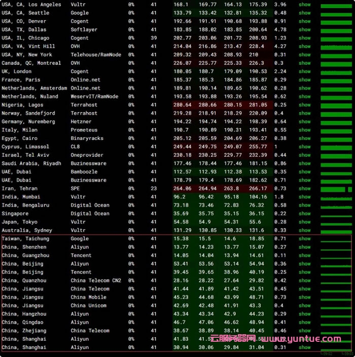 可以看到全球各地的稳定性都是相当不错的,基本都没有丢包的情况,在中国台湾、深圳、广州、杭州、青岛、北京等地延迟也是很低,并且网络都很稳定,丢包率都是0%,Ping几十下也是没有丢包的。