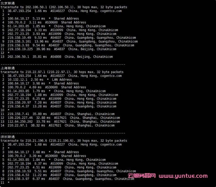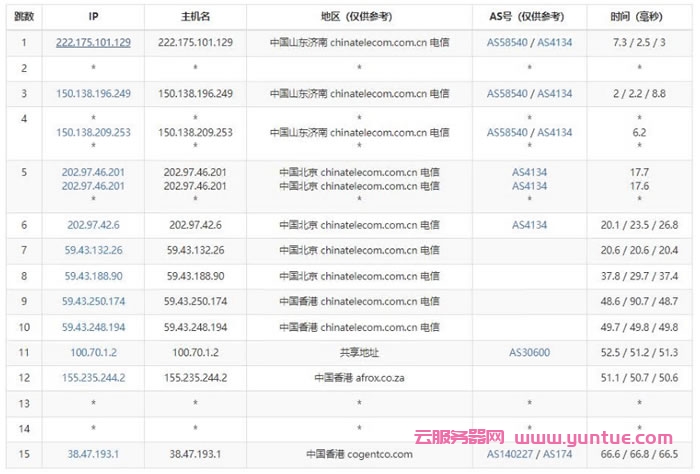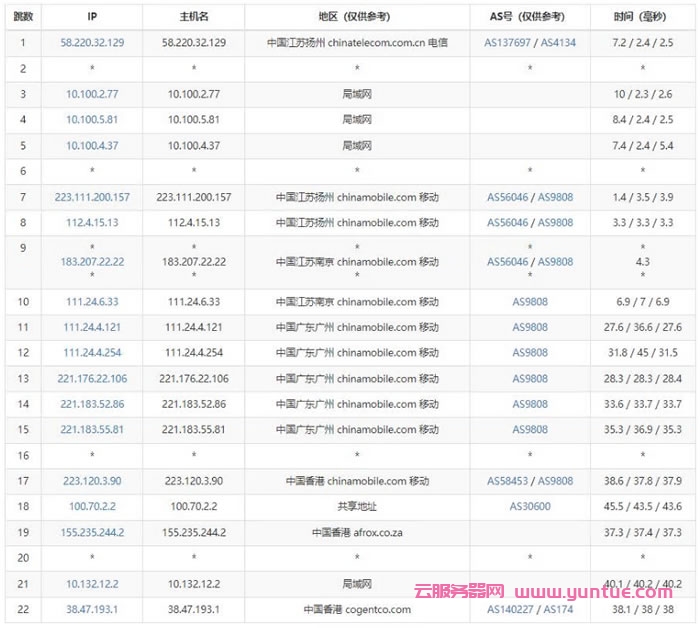测试完了网络稳定性情况,我们再测试下这款香港站群服务器的去程和回程路由情况。