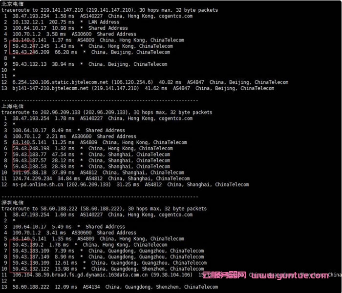 电信回程路由是从北京、上海、广州三个网口入境,然后线路直连,并且走的是59.43的CN2 GIA线路,所以确实是双向CN2 GIA线路。