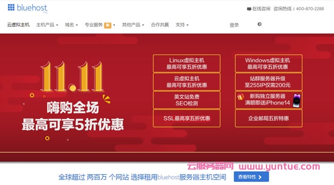 活动期间购买购买BlueHost美国/香港服务器可以享受九折优惠,与此同时满1000元,可以获得手机充值100元;满4000元,可以获得JD购物卡500元;满6000元,可以获得JD购物卡1000元;满10000元,可以获得JD购物卡2000元;满40000元,可以获得iPhone13ProMax。