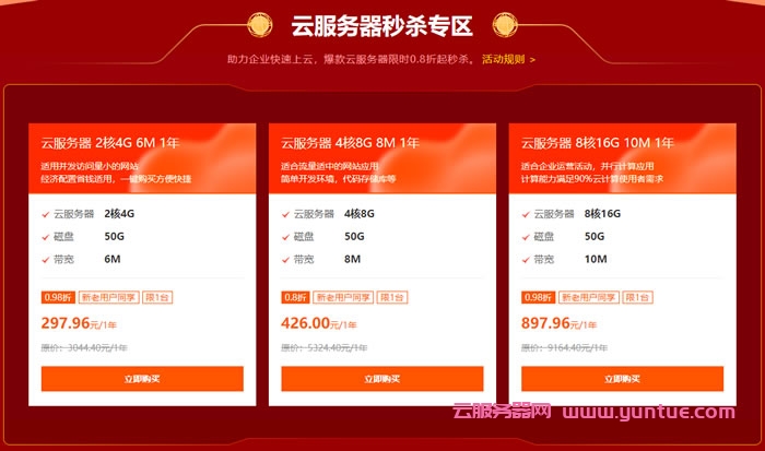 | 云服务器 2核4G 6M 1年 | 云服务器 4核8G 8M 1年 | 云服务器 8核16G 10M 1年 |