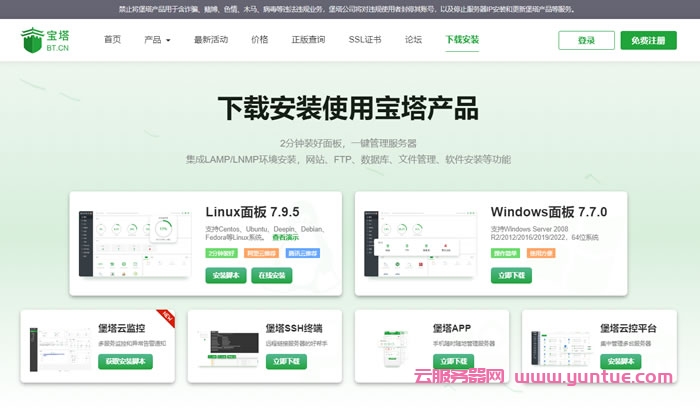 宝塔是安装在服务器上吗?是的,一般的物理服务器或云服务器都是可以安装的,比如阿里云ECS,阿里云轻量云,百度阿里云腾讯华为等各个云厂商都是可以的,比如:易探云国内高防服务器及云服务器也是可以安装的。虚拟主机则没法安装宝塔面板的,这个要非常的注意,很多不清楚的容易买错了。那么,今天介绍一下如何在服务器上安装宝塔面板,宝塔Linux面板的详细安装步骤!