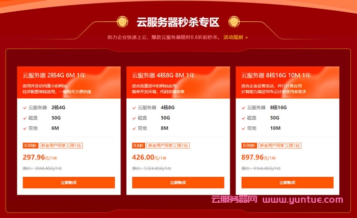 | 云服务器 2核4G 6M 1年 | 云服务器 4核8G 8M 1年 | 云服务器 8核16G 10M 1年 |