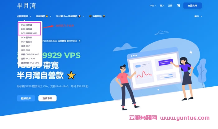 下面简单说一下半月湾美国VPS的购买入口。通过半月湾官网链接进入后,选择“虚拟服务器”下的洛杉矶几个机房,如下所示: