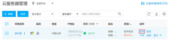 选择您要重启的云服务器点击【管理】,打开服务器详情页面。
