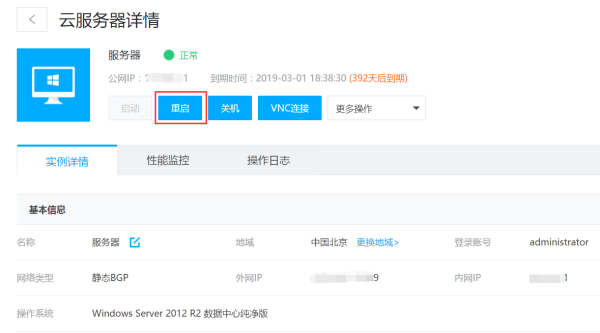 重启实例后,云服务器会进入“重启”状态,几分钟后,实例重启完成后会自动进入“运行中”状态,这个过程中您无法对实例进行操作。