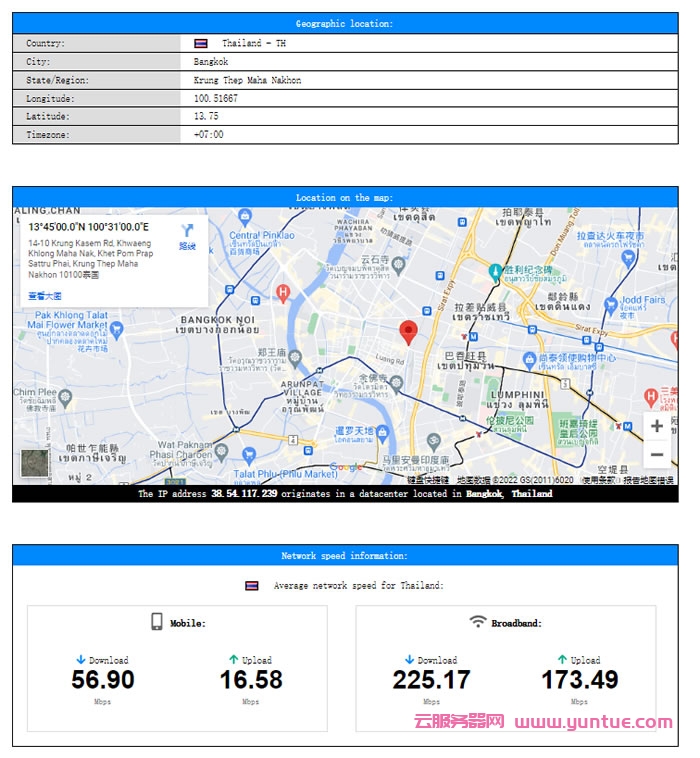 首先,我向客服申请了一台测试机器,在几个大的IP库查询了一下,他们家的IP所在地和DNS确实在泰国曼谷,如下图: