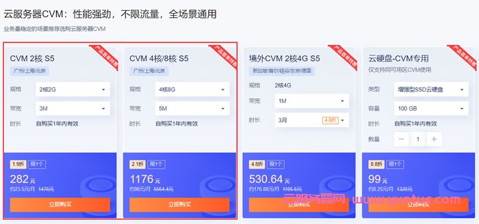 腾讯云有秒杀优惠活动,腾讯云CVM 2核2G3M云服务器也是282元/年(标准型S5实例,广州/上海/北京地区选项),腾讯云CVM 4核8G5M云服务器也是1176元/年(标准型S5实例,广州/上海/北京地区选项)!