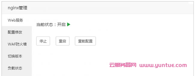 在Nginx管理界面,您将会看到有Web服务、配置修改、WAF防火墙、切换版本、负载状态等多个菜单项。切换到Web服务选项卡,在该页面中,您可以停止或重启当前Nginx服务和重新加载Nginx配置文件。