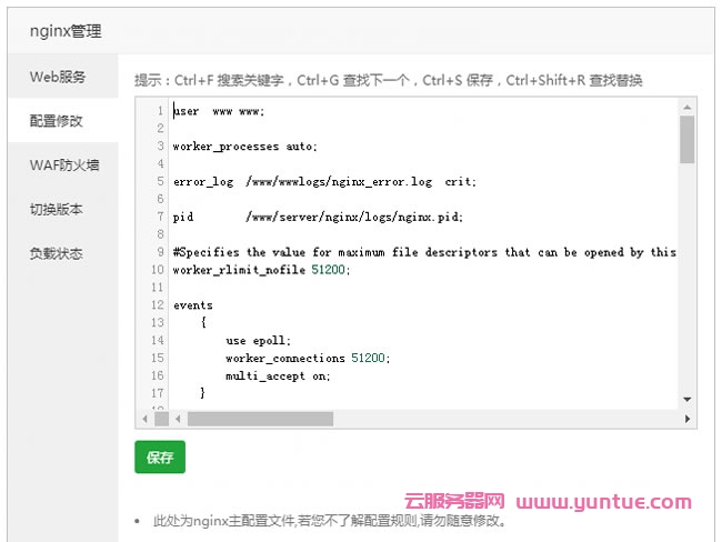 另外,您也可以切换到“配置修改”选项卡,修改当前的Nginx的配置文件,如果需要使当前配置生效,请在Web服务中重载配置文件。
