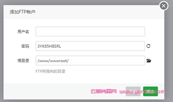 您在用宝塔面板创建FTP账号时,可根据页面提示输入以下参数,点击提交即可创建成功。