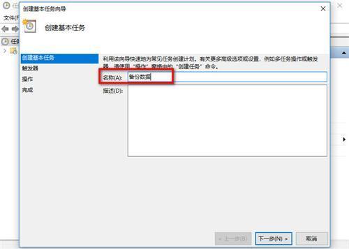 4.进入到“创建基本任务向导”,在第一项的“创建基本任务”面板中为任务计划起名,例如为这个任务起名为“数据备份”,完成后进入下一步。