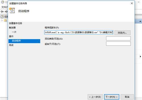 7.在“启动程序”面板中输入程序脚本”C:\Program Files\WinRAR\WinRAR.exe\” a -ag -ibck ” D:\数据备份\数据备份.rar” “D:\编辑文档”,然后进入下一步。