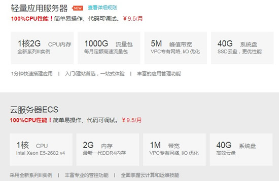 阿里云学生服务器(都是 100%CPU 性能)有两款(只能二选一),分别是 1 核 2G 轻量应用服务器和 1 核 2G 云服务器 ECS,价格都是 9.5 元/月,114 元/年。