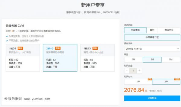 如果不想备案的,直接香港、韩国服务器,最理想的是香港。2核4G3M推荐这个3年2000多元。其实,很划算了。只要对比下阿里云,你会发现2000只能买阿里云2核4G1M/1年。但是,腾讯云却有3年了。香港续费是很贵的,也建议一次3年。
