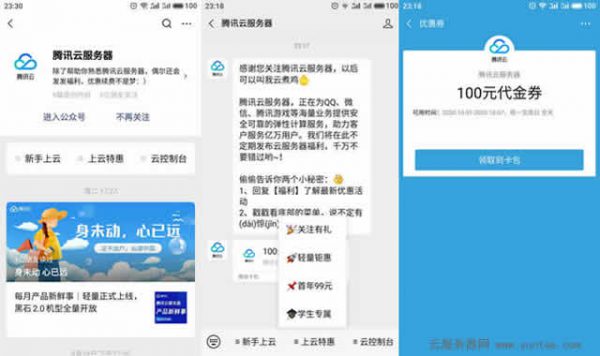 4、关注[腾讯云服务器]公众号,可领代金券199-100元