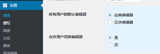 2、插件的设置:管理员登录站点后台 >> 设置 >> 撰写 >> 设置所有用户的默认编辑器为经典编辑器或区块编辑器,设置是否允许用户切换编辑器 >> 点击【保存更改】。