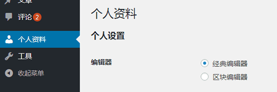 4、用户切换编辑器:用户(包括管理员)登录后台后 >> 点击右上角的“编辑我的个人资料”>> 个人设置中第一个就是编辑器的选择,选择好编辑器后点击【更新个人资料】即可。