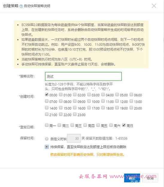 4、根据提示输入策略名称,策略执行的时间、日期,最后设置快照保存的时间,点击确定完成。
