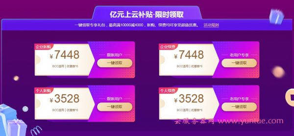 首先,一键领取专享礼包,最高满10000减4000,新购、续费均可享受超值优惠。一共有以下四种优惠券: