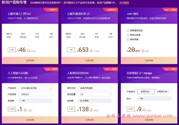 活动期间注册并实名的新用户,首次购买以下产品享可享优惠,每类产品限购1次。主要有以下几款云服务器和云产品推荐: