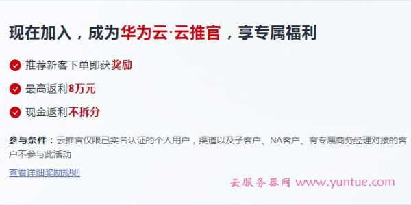 在华为云专门设置的额外推广福利活动中,如果推荐人推荐的新客户成功购买热门指定套餐,则可获得大额度的华为云代金券。在这里,小编还做了精华规则提取: