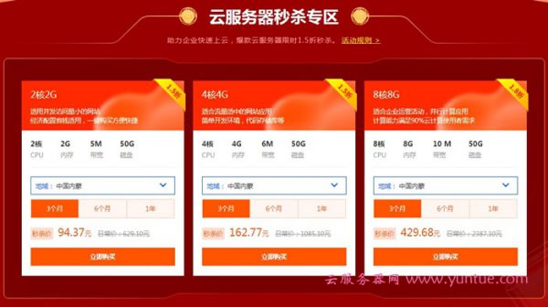 这个专区新老用户不限,有3款云服务器可限时秒杀,1.5折起,价格看起来也不贵,配置:2核2G 5M、4核4G 6M、8核8G 10M,对于我来说2核2G 5M也足够满足我的个人需求了,时长有3个月、6个月、12个月可选,这个蛮不错的,以前的活动都是只有1年时长可以选的,这次可以选择3个月的。