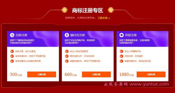 貌似这个商标注册服务也是小鸟云最近上线的,对于企业品牌来说也是蛮重要的,分为三种形式,自助注册、顾问式注册、担保注册对应不同的价格。