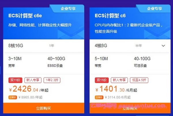 阿里云2020年双十一,新人用户可选配置并不丰富。如果你想买高配云服务器可能需要企业用户了。而且好像主要有二款针对新人用户的,比如:8核16G3M计算型c6e,2426.04元/年,而4核8G5M计算型C6,1401.30/半年(好像只能选择半年哦)。<<点击进入查看购买