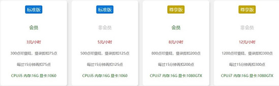尊享版: 会员8元/小时,登录即扣200点,每过十五分钟再扣200点非会员12元/小时,登录即扣300点,每过十五分钟再扣300点