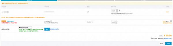 2.我们进入续费域名 页面 会看到续费是69一年,我们可以填写域名续费优惠口令 如下图所示 填写以后会变成60元/年