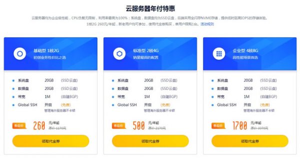 1核2G 260元/年起,新老用户均可参加,使用代金券购买,单用户限购1台。
