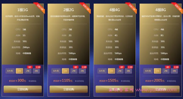 1核CPU,1GB内存,80GB硬盘,2Mbps带宽,价格300元/年