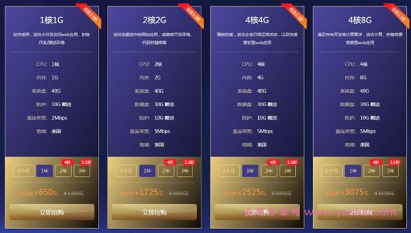 4核CPU,4GB内存,70GB硬盘,5Mbps带宽,价格2525元/年