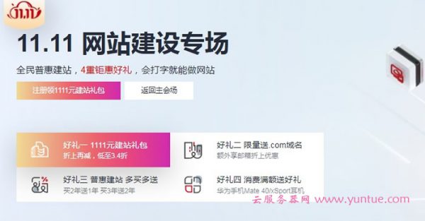 好礼一 1111元建站礼包,折上再减,低至3.4折;好礼二 限量送.com域名,额外享邮箱折上优惠;好礼三 普惠建站 多买多送,买2年送1年 买3年送2年;好礼四 消费满额送好礼,华为手机Mate 40/xSport耳机