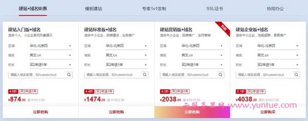 这个活动一共分为五个版面:建站+域名钜惠、模板建站、专家1v1定制、SSL证书、协同办公,这里主要介绍”建站+域名钜惠”这个活动吧。