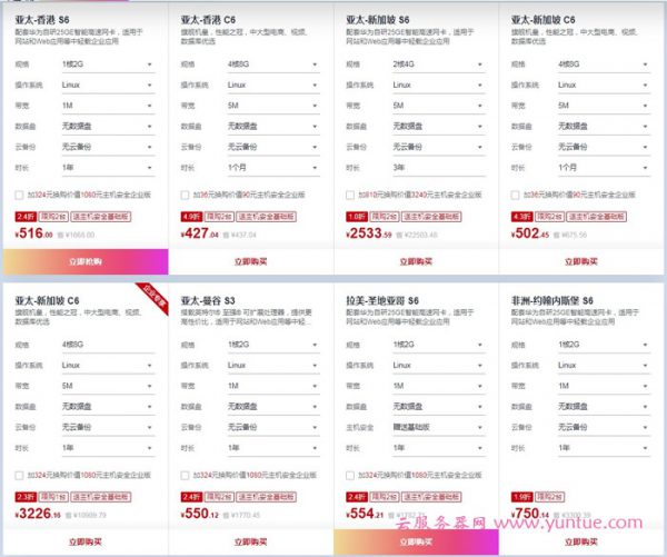 具体配置对应的价格请大家前往华为云双 11 全球云服务专场中的“全球精选云服务器专区”了解选购。下面云服务器网(www.yuntue.com)根据云服务器所在地域仅列出部分规格的 Linux 服务器及带宽对应的优惠价格,具体如下: