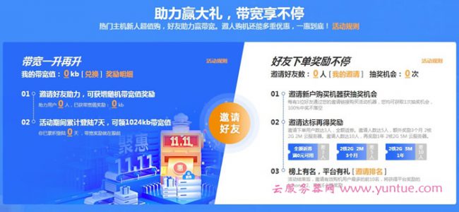 邀请下单用户数达3人,全额返券。邀请人数达5人,额外奖励3个月 2核2G 2M 云服务器。邀请人数达10人,再奖励1年 2核2G 5M 云服务器。