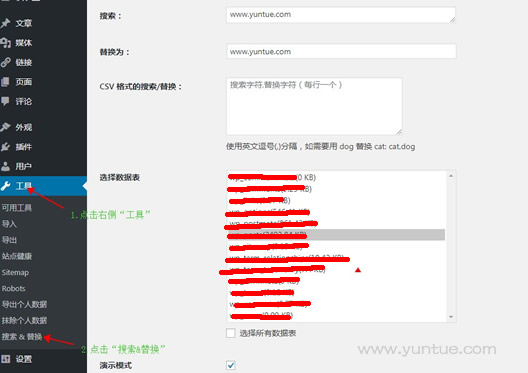 安装完毕在后台工具中进入“搜索&替换”就是插件设置了。功能包括备份数据库,查找与替换URL等。我们主要用到的是查找与替换功能。查找输入旧链接,替换为输入新链接,选择所有表或者根据需要选择部分表,预演模式允许你演练一下,不会真正的覆盖数据库。