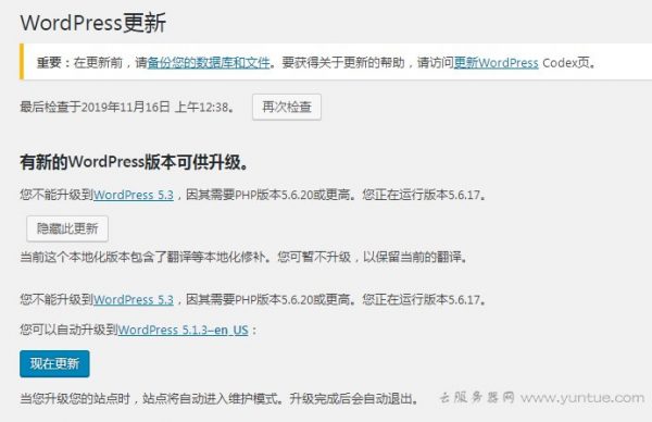 WordPress手动升级最麻烦的就是上传Wordpress程序包了,好在我们可以先将最新版本的Wordpress打包上传再在服务器上解压,这样就能大大节省升级所需要的时间了。下面云服务器网(www.yuntue.com)就为大家介绍一下手动升级wordpress教程的详细步骤。