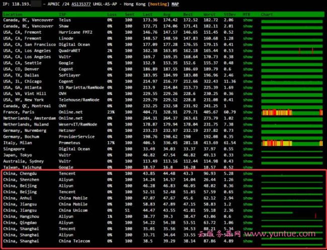 2、UCloud香港云服务器全球节点抖动及丢包测试。红框位置是国内测试节点,电信、联通、移动三网均有测试节点。稳定性、丢包现象是非常少的。如果是用于建站的话,网站打开速度是有保障的。