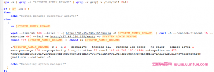 如果没有在运行中,则下载xmrig挖矿木马到/tmp/ .admin_thread,伪装成系统管理进程“System manager”,然后启动挖矿程序。