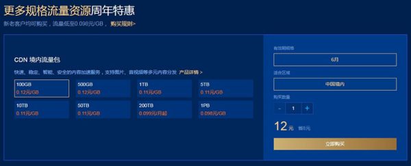 腾讯云 CDN 七周年感恩回馈活动中,老古建议大家尽量在“爆品限量秒杀”活动中抢购,毕竟这里的境内流量包相对比较便宜。如果没有找到合适规则的 CDN 流量包,可以在“更多规格流量资源周年特惠”活动中直接选购,新老客户均可购买,流量更是低至 0.098 元/GB,立即前往了解选购