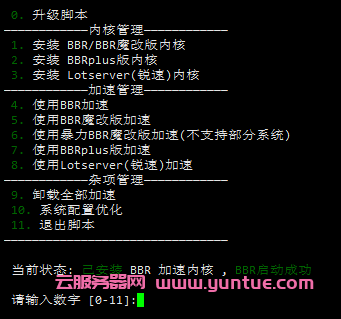 通过 SSH 登录 VPS 云服务器,在面板最下面会显示当前是否安装了加速,是否启用成功。