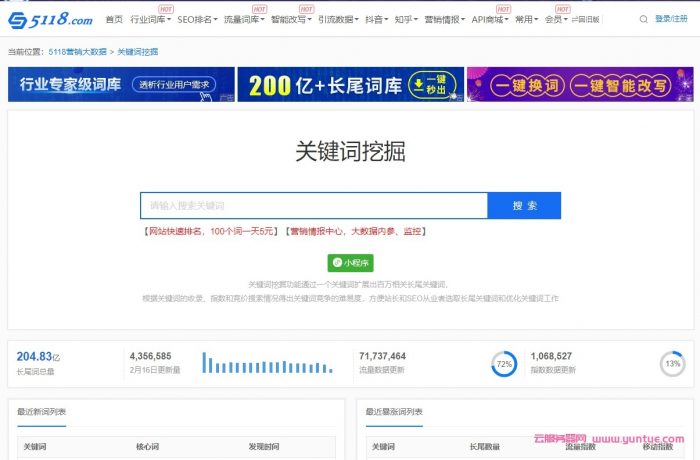 5118是互联网大数据挖掘网站,通过对SEO各类大数据挖掘,提供关键词挖掘,各行词库,网站收录,实时对关键词排名监控以及群站SEO权重监控。