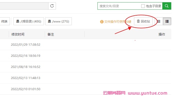宝塔面板的回收站:打开宝塔面板 – 在左侧的主栏目菜单中点“文件”进去 – 在页面的右上角有个【回收站】