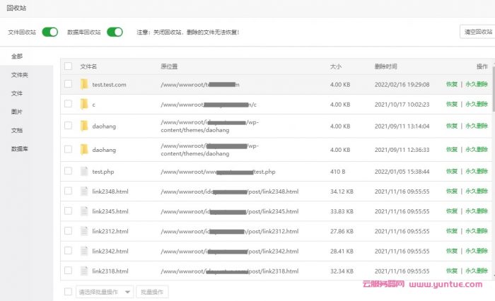 那么,这个里面的文件就都是删除过的,你可以选择彻底删除或者恢复文件。只要我们开启回收站功能(回收站是默认开启的),就可以将误删除的文件,从回收站恢复过来!所以,平时我们使用宝塔过程中,千万不要关闭回收站,如果硬盘空间不够了,一定要升级哦!